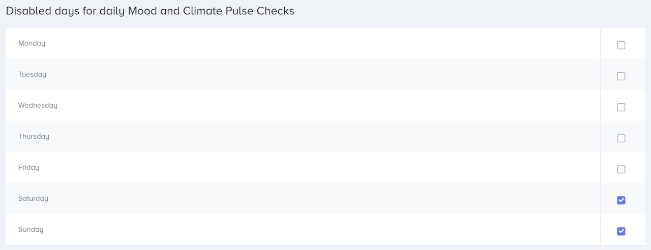 By checking the box next to the day of the week, the Pulse questions will not be available on those days.