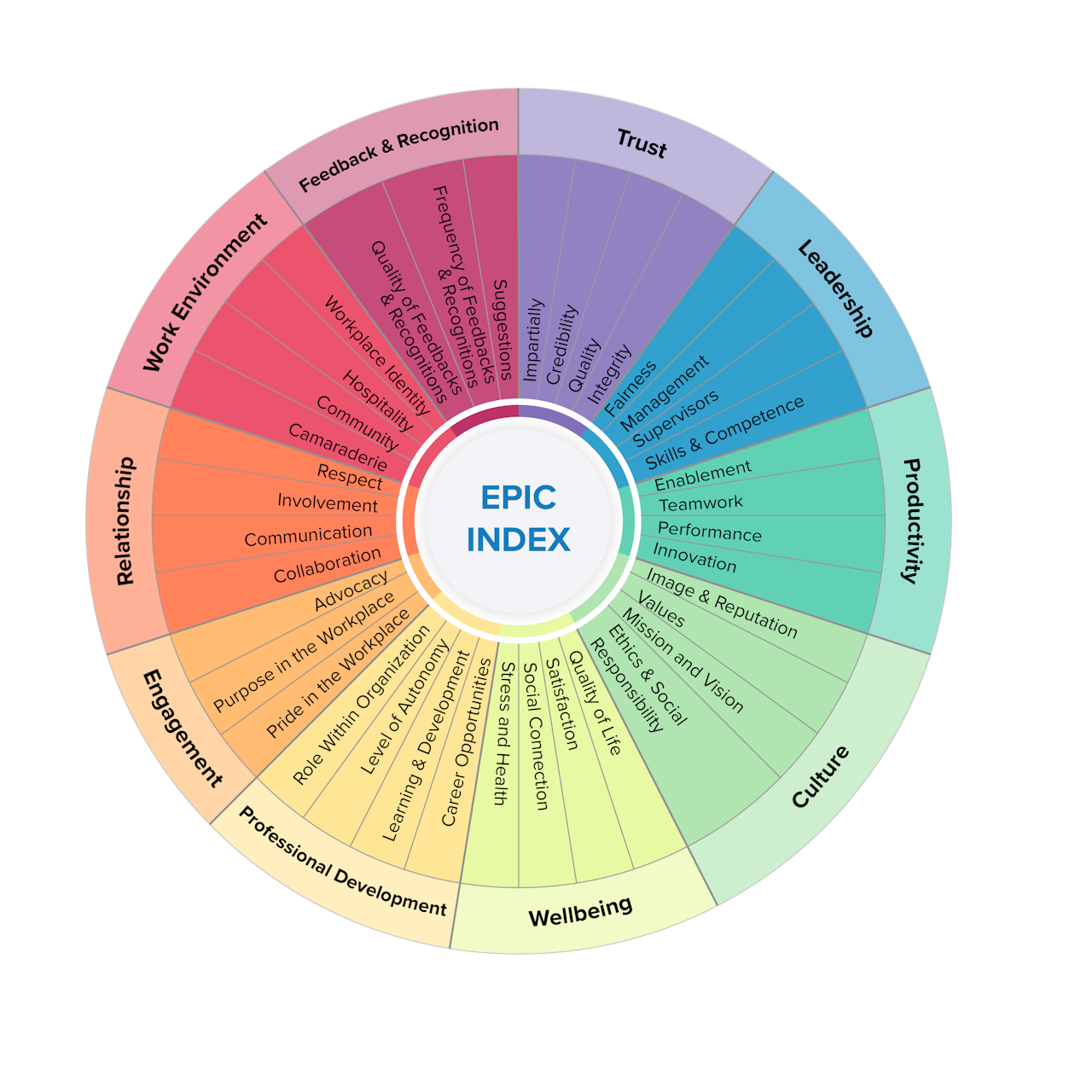 Camaraderie embodies a sense of camaraderie and mutual trust among team members. It includes relationships, harmony, and friendly interactions in the workplace. The questions in this dimension aim to measure the level of camaraderie and interpersonal connection that the organization fosters, both among colleagues and between supervisors and their team members.